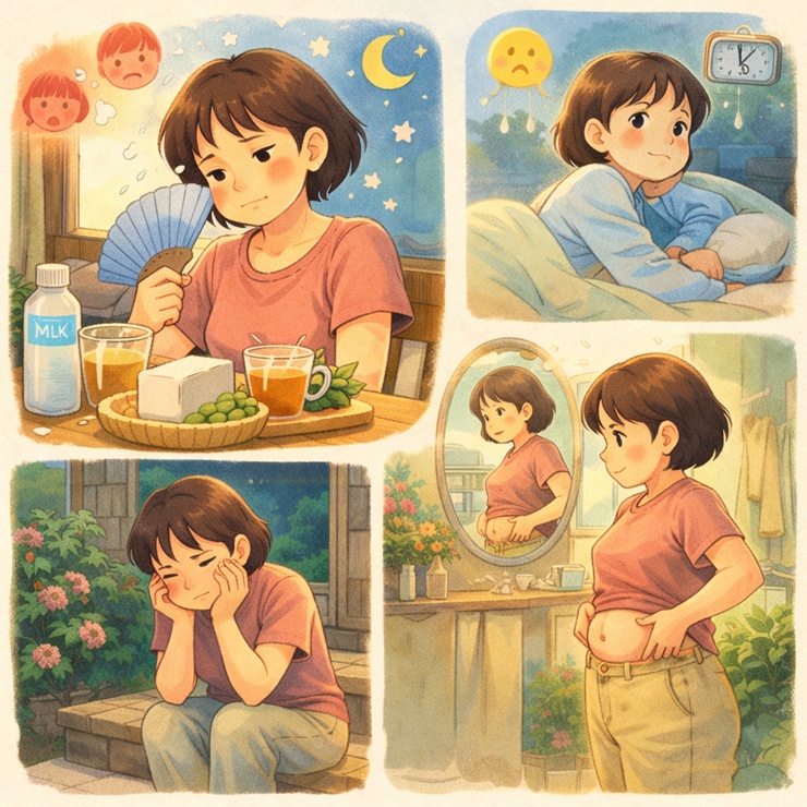 호르몬 변화로 인해 몸과 마음에 다양한 신호가 나타나는데요. 대표적으로 안면홍조, 불면, 감정기복, 체중중가등이 있습니다.